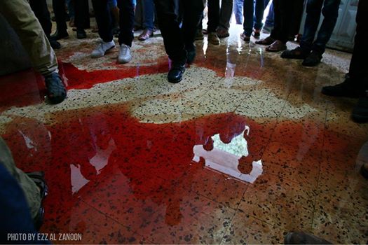 Blood of Tayseer Al-Batsh’s family who were killed in an Israeli air raid, are seen at a hospital morgue in Gaza City, on July 13, 2014. The Israeli air strike on the family home of Al-Batsh, Gaza’s police chief, killed 18 people on Saturday, Gaza’s health ministry said, and Hamas fired the largest salvo of rockets yet on Tel Aviv since the start of the Jewish state’s offensive in the Palestinian enclave. The strike on the home of Al-Batsh in Gaza City was the deadliest bombing since Israel launched its offensive on Tuesday to end Palestinian rocket fire into its territory. Israel’s offensive has killed 145 Palestinians since Tuesday. Gaza medical officials said at least 82 civilians, including 25 children, were among the dead from the air strikes on the territory into which nearly 2 million people are packed.Photo by Ezz Al Zanoon, Gaza, Palestine.