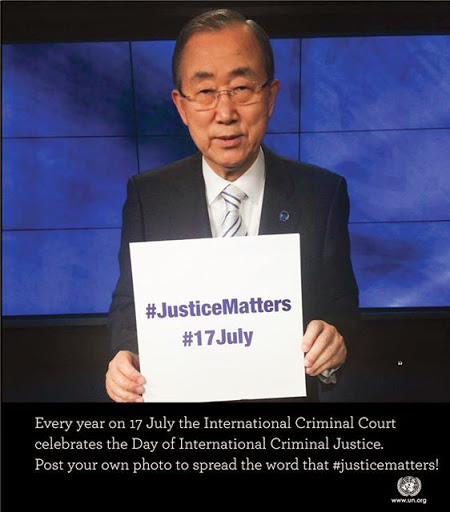 Ban Kin Moon holding a sign on July 17 celebrating International Criminal Court, The body in charge to keep justice in the world, and punish those that transgresses it.