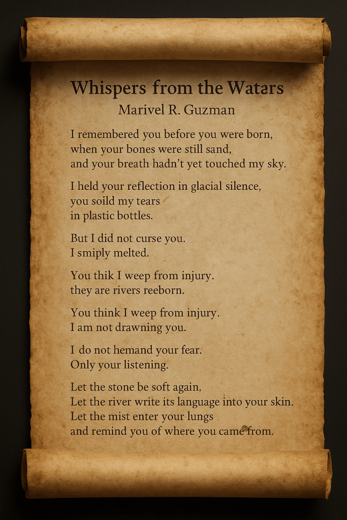 “Whispers from the Waters” by Marivel R. Guzman, rendered as a poetic scroll—words etched with reverence for Earth’s memory and voice. Credit: Image generated by Akashma News editorial team using AI tools under artistic direction of Marivel R. Guzman.