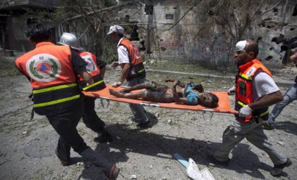 A boy severally burnt is being carried by the Palestinian paramedics in Shuyaiya Gaza July 20 2014, during the assault on the Gaza neighborhoods.
