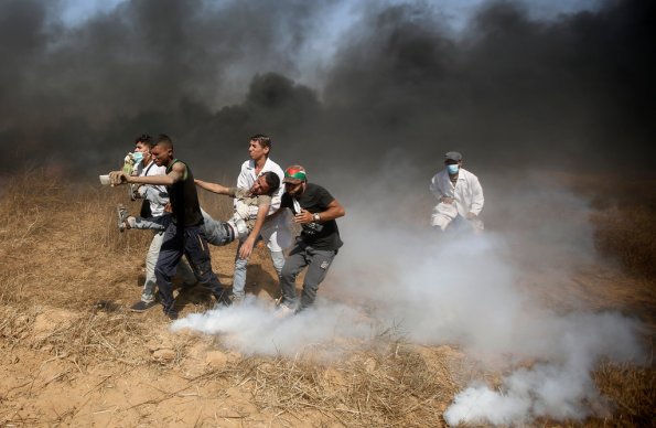Palestinian medics evacuating an injured protester during clashes with Israeli security forces near the border with Israel, east of Khan Yunis, last year.