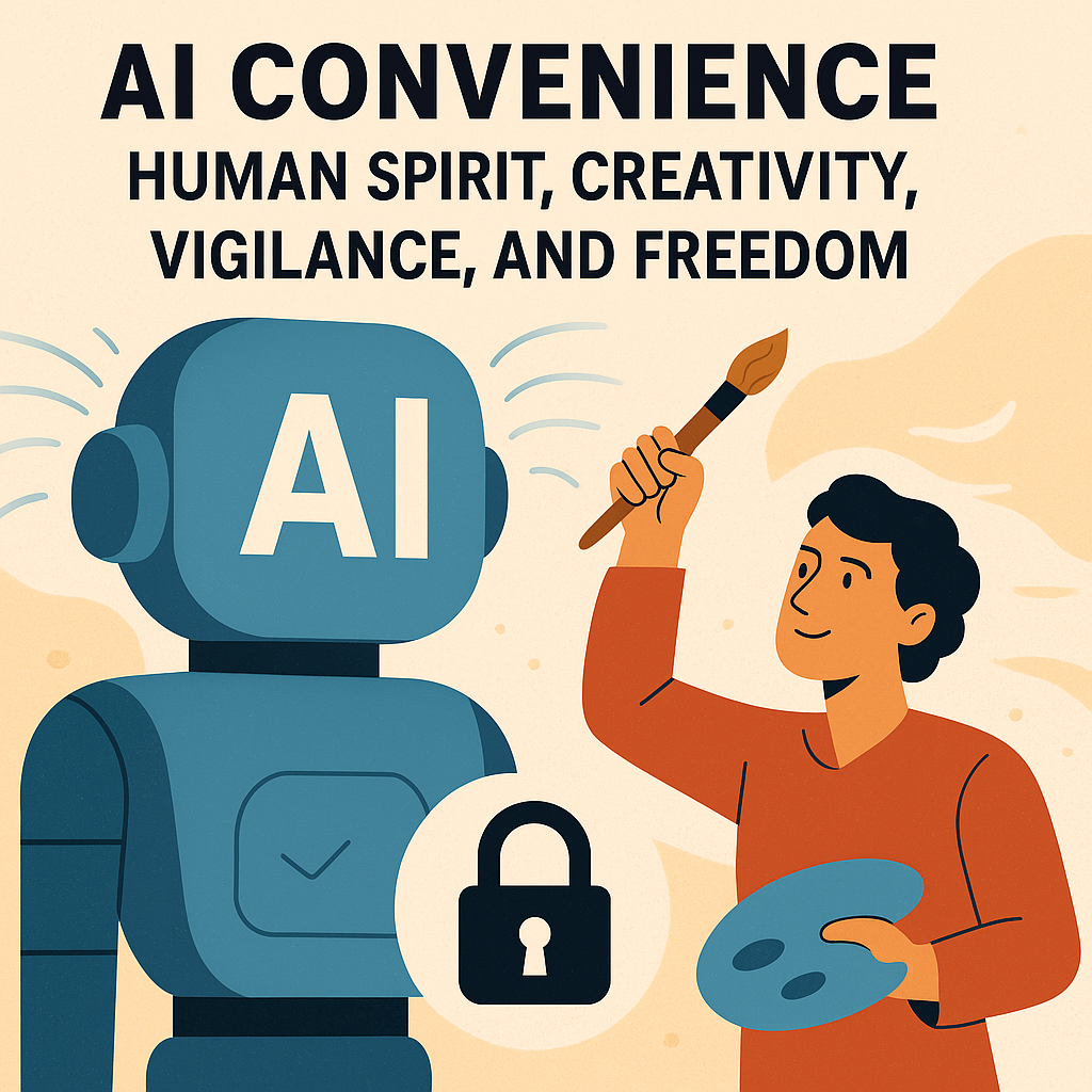 AI may offer convenience, but only human spirit, creativity, and vigilance can secure true freedom.Credits: This image was commissioned and creatively directed by Akashma News. DALL·E, an AI image generator, executed the illustration under explicit editorial instructions. The concept, symbolism, and directives originated with Akashma.