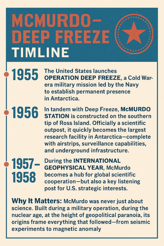 McMurdo was never just about science. Built during a military operation, during the nuclear age, at the height of geopolitical paranoia, its origins frame everything that followed—from seismic experiments to magnetic anomaly research.