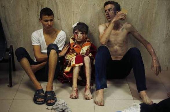 Two boys and a child visible injured sits probably waiting for medical attention Gaza July 20 2014
